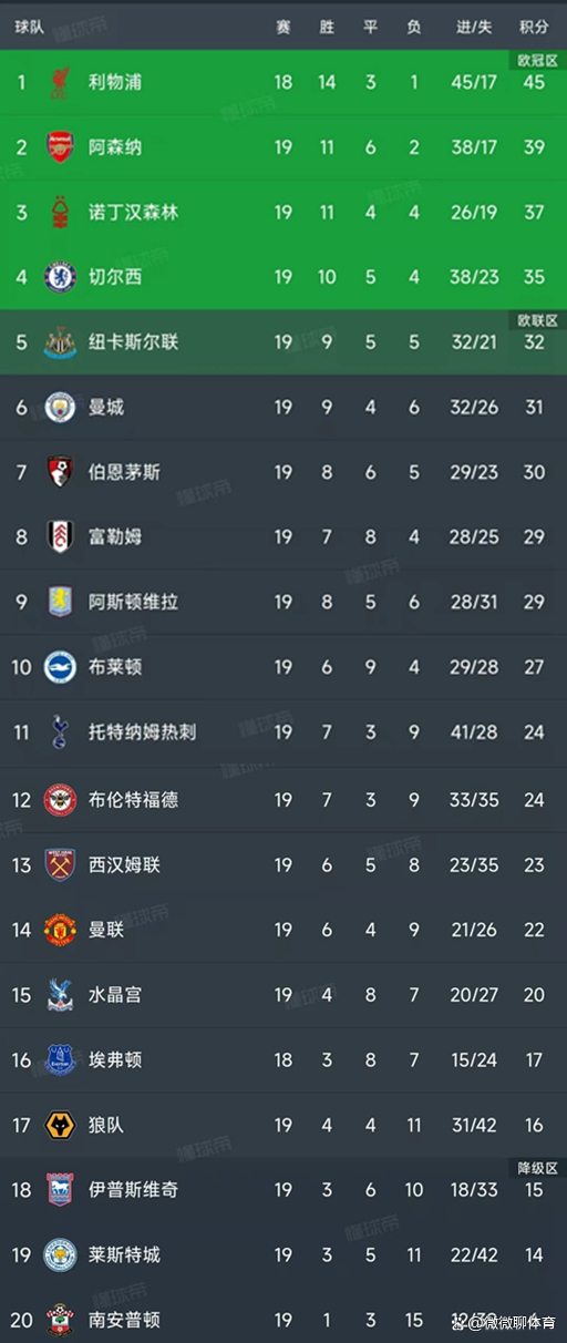 利物浦领头羊的位置不行撼动,本轮他们在主场5-0大捷西汉姆联豪取3连胜,本赛季出战的18场比赛只是输掉1场,当今的积分是45分,少赛一轮高建树后的敌手6分。由于曼城、蓝军、枪手王人遇到了各自的问题,进展理会的赤军照旧成为本赛季最具有冠军相的戎行。