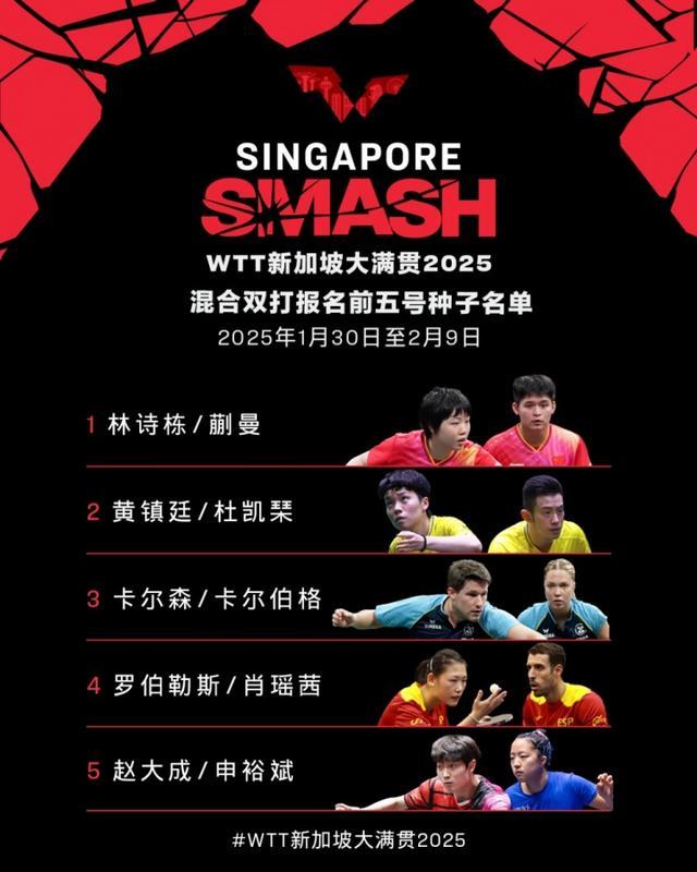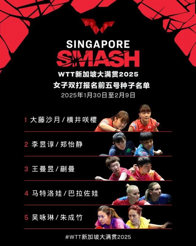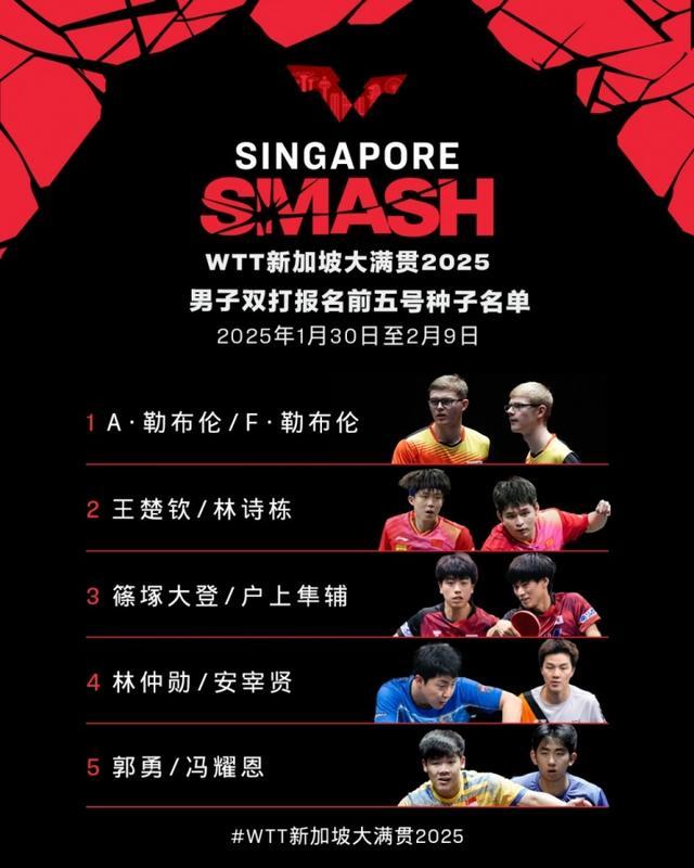 直播吧1月2日讯 WTT天下乒联公布新加坡大满贯双打参赛名单,比赛将于1月30日至2月9日在新加坡体育中心举办。把柄报名达成时的天下名次,各项当今五名单出炉。